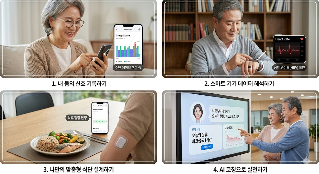 과거에는 의사나 전문가의 지시에 수동적으로 따랐다면, HQ가 높은 현대인은 스마트워치, 연속 혈당 측정기(CGM), AI 건강 앱 등을 통해 수집된 데이터를 직접 분석합니다. "나에게 맞는 적정 수면 시간은 언제인가?", "어떤 음식을 먹었을 때 혈당 스파이크가 발생하는가?"를 스스로 파악하고 대응하는 능력이 바로 건강지능입니다.
