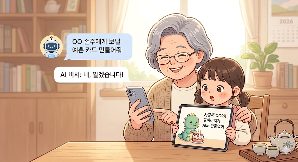 - 디지털 편지와 아바타: 명절이나 생일에 평범한 메시지 대신, AI로 만든 재미있는 캐릭터 이미지나 손주의 취향을 반영한 시(詩) 한 편을 보내보세요. "우리 할아버지 최고!"라는 반응을 이끌어내는 데 1분도 걸리지 않습니다.