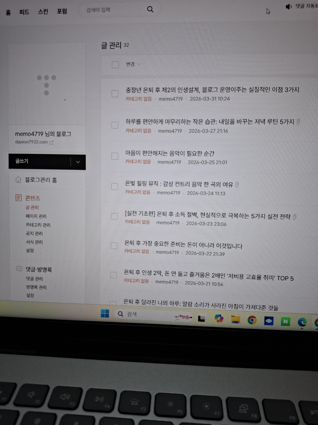 제 블로그 관리자 화면입니다. 어제 늦은 시간까지 이 쫀득쫀득한 키보드를 두드리며 글을 정리했습니다. 타자 치는 맛이 어찌나 좋은지, 손마디 하나 아프지 않고 기분 좋게 작업을 마칠 수 있었죠. 제가 쓴 "중장년 은퇴 후 제2의 인생 설계"라는 글 제목들을 보고 있으면, 이 노트북이 단순한 기계가 아니라 제 꿈을 담는 소중한 그릇이라는 생각이 듭니다.